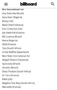 Tyla (South Africa), Rema (Nigeria), Ayra Starr (Nigeria), Any Gabrielly (Brazil), Basky (UK), Ezra Collective (UK), Uncle Waffles (Swaziland), Joé Dwèt Filé (France), Luanna (Brazil), and SDM (France).